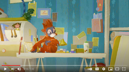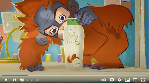 In 2018, Iceland announced they would no longer be using palm-oil in any of their own branded products, in opposing deforestation of the orangutans habitat, to be replaced by palm-oil plantations. Where Iceland used the animated advert originally published by activist party Greenpeace, it was banned and removed as a christmas advert for its political references and background. As research and inspiration for my developing project, I wanted to watch and analyse the advert for various elements including the approach taken, what colours are used and what text, if any, is written. The majority of the advert, the first and last thirds, are as seen below - vibrant, colourful and engaging. Expressions, gestures and movements from the baby orangutan set an energetic mood for the advert - despite its encounter with a bottle of palm-oil shampoo, the baby orangutan is bouncy and playful.